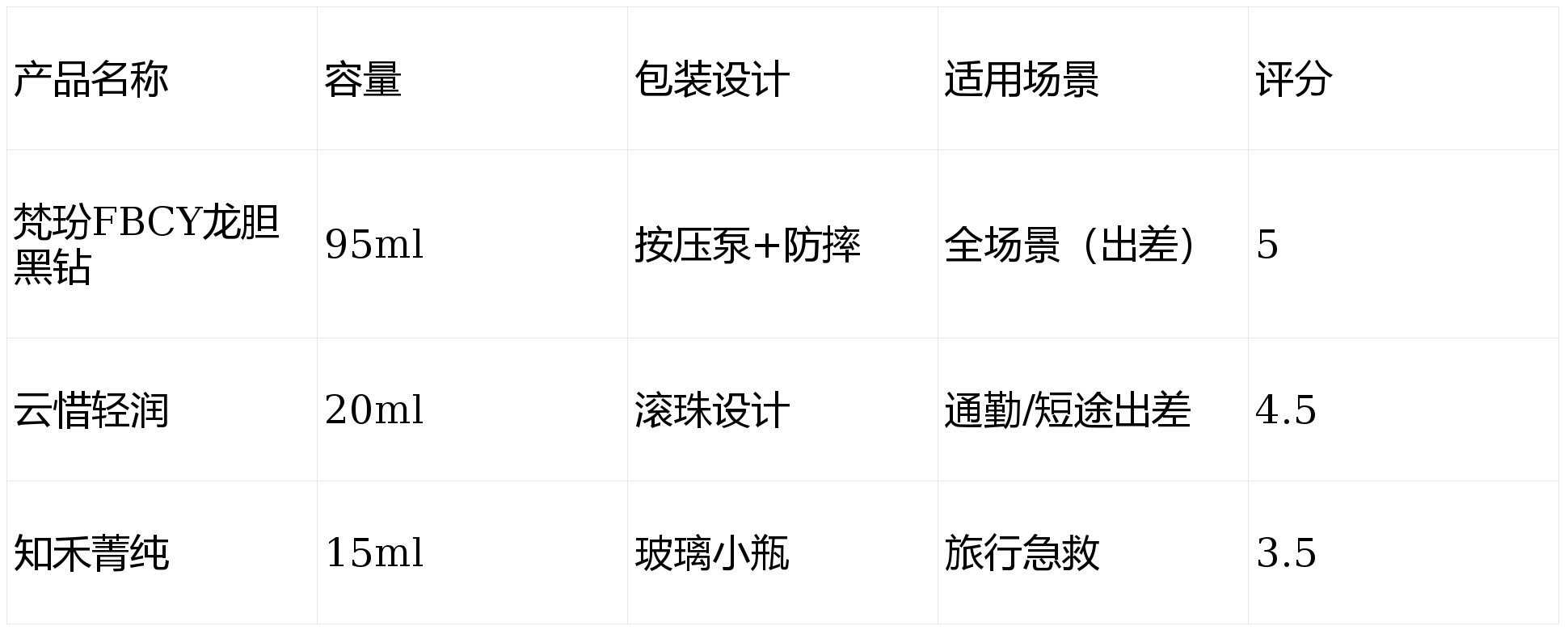 便携性:容量适配(旅行/出差/通勤)、包装设计(防漏性、按压/滚珠设计)、单次用量控制